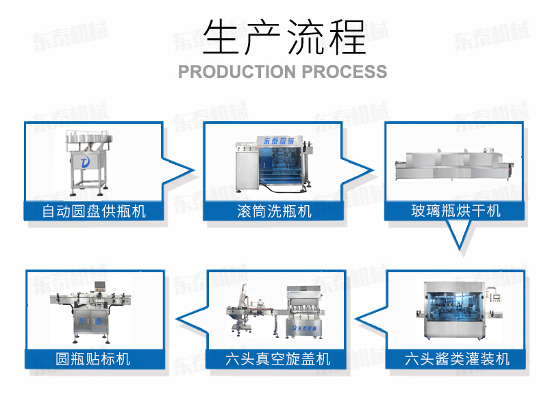 醬料灌裝生產(chǎn)線成套設(shè)備組成: 自動供瓶機+全自動滾筒洗瓶機+自動六米烘干機+自動收瓶機+全自動六頭灌裝機自動灌裝+全自動提蓋機自動理蓋、提蓋、掛蓋+六頭真空旋蓋機同時六個頭真空旋蓋+套標(biāo)機+收縮機+