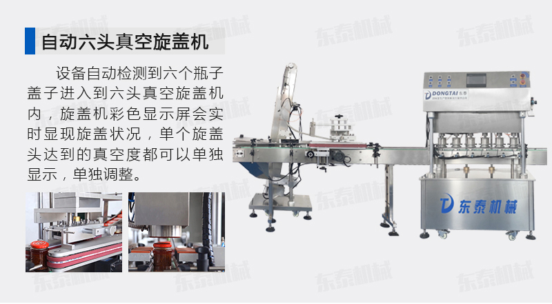 該直線式真空旋蓋機是東泰機械結(jié)合用戶使用的情況,摒棄了傳統(tǒng)轉(zhuǎn)盤式真空旋蓋機的弊端,研制開發(fā)的設(shè)備,設(shè)備自動檢測到六個瓶子蓋子進入到六頭真空旋蓋機內(nèi),旋蓋機彩色顯示屏?xí)䦟崟r顯現(xiàn)旋蓋狀況,整機多點檢測,當(dāng)進口無瓶無蓋、出口堵塞、定位不準(zhǔn)、瓶身傾倒均自動停機。單個旋蓋頭達到的真空度都可以單獨顯示,單獨調(diào)整!