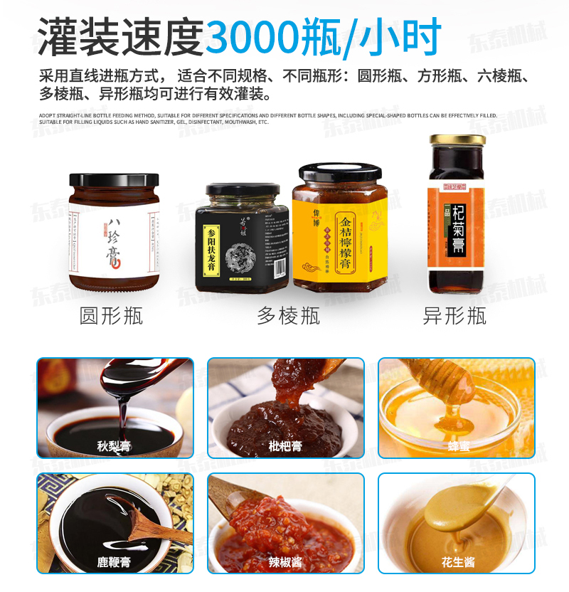 秋梨膏灌裝機(jī)生產(chǎn)線(xiàn)設(shè)備適用于各種1、各種膏滋如:秋梨膏、枇杷膏、鹿鞭膏、蜂蜜等的灌裝。2、調(diào)味醬如:香菇醬、辣椒醬、豆瓣醬、花生醬、芝麻醬、牛油火鍋底料、紅油火鍋底料。3、采用多規(guī)格的灌裝轉(zhuǎn)閥、灌裝頭,可適應(yīng)不同客戶(hù)物料的灌裝需求。