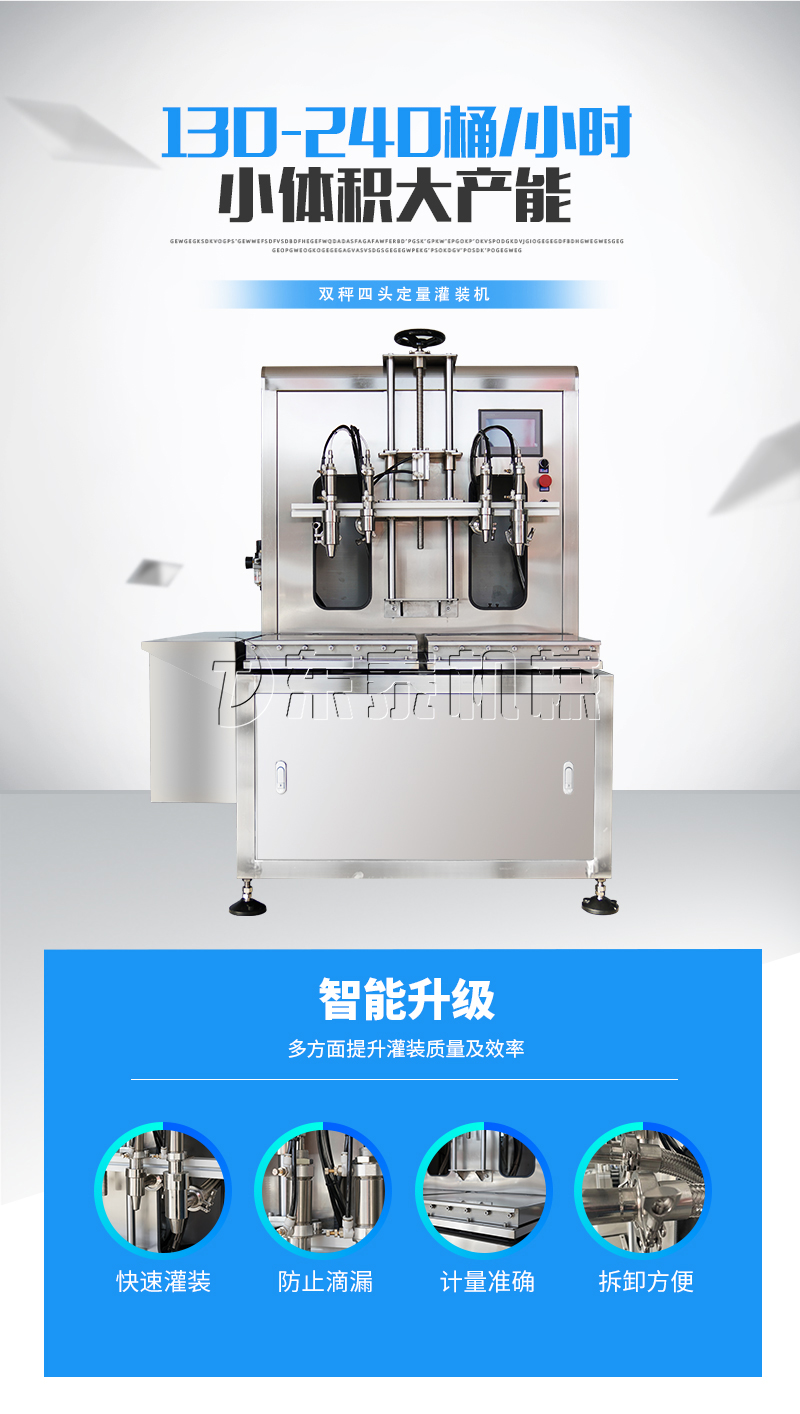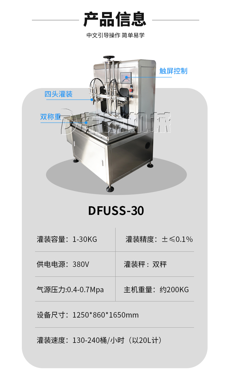 產(chǎn)品名稱:雙秤四頭定量灌裝機(jī) 型號(hào):DFUSS-30 產(chǎn)品說明:   該灌裝機(jī)適用于各種油類以及粘稠液體的灌裝。如:潤滑油、防凍液、化工原料等   &nbs