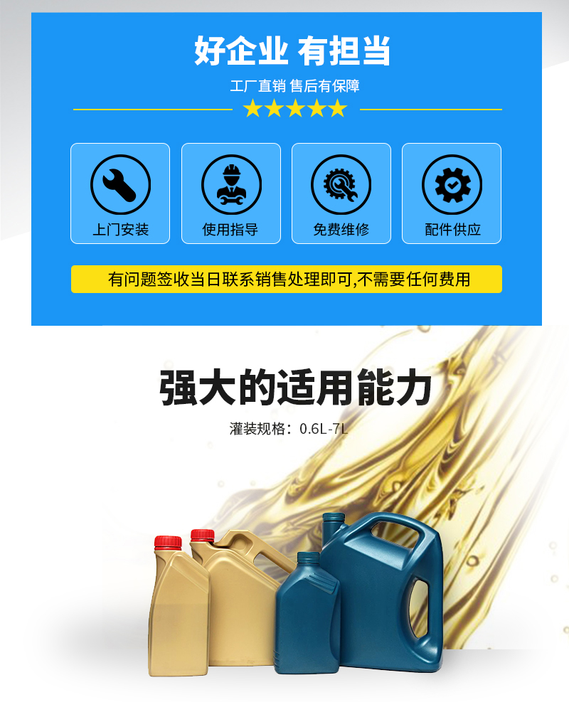 機器應(yīng)用范圍:1-10升通用型號,機器采用流量計計量,觸摸屏控制,參數(shù)一鍵調(diào)整,方便快捷。可以灌裝各種油脂,油料。灌裝頭采用專用的油脂防滴漏灌裝頭,不滴漏。機器設(shè)定有快慢速技術(shù),可以先快后慢,防止物料噴濺。保持生產(chǎn)車間干凈潔凈。