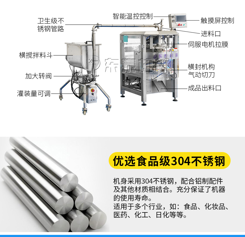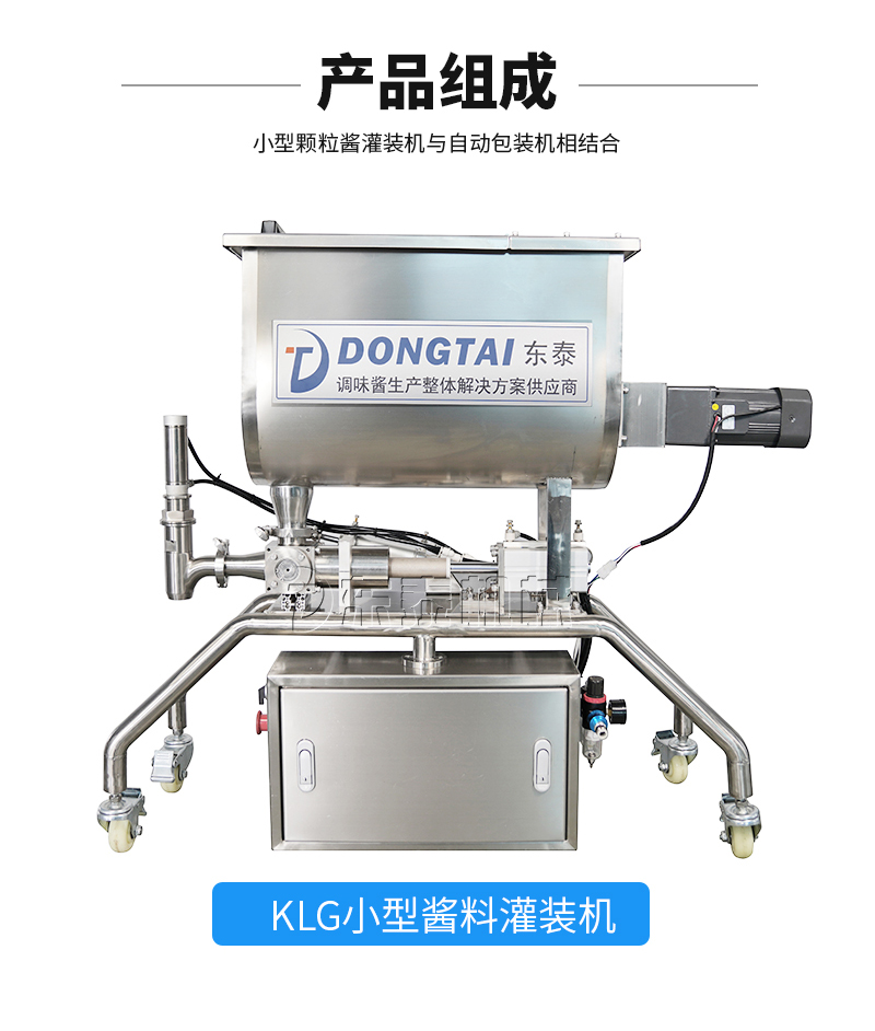 本機(jī)器主要用于調(diào)味品醬料的自動化包裝,機(jī)器安裝有橫向螺帶式攪拌,使油醬混合均勻,確保灌裝精度和產(chǎn)品包裝成品的均勻性。灌裝計量設(shè)備安裝有萬向輪,管路鏈接均采用快拆接頭,方便灌裝機(jī)拆卸移動清洗。包裝設(shè)備采