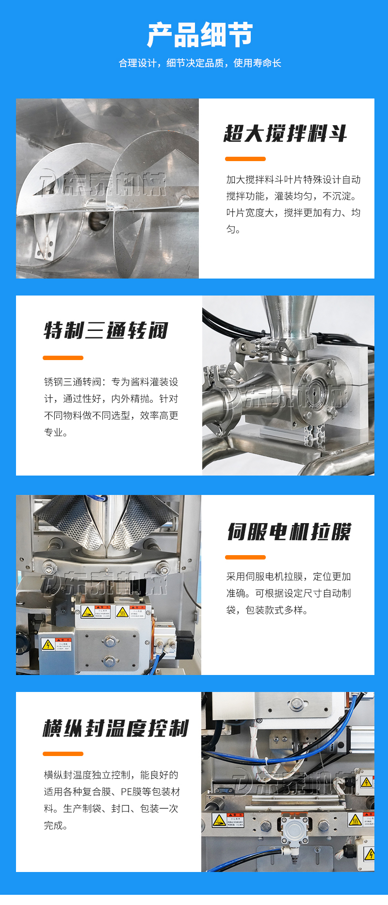 本機(jī)器主要用于調(diào)味品醬料的自動化包裝,機(jī)器安裝有橫向螺帶式攪拌,使油醬混合均勻,確保灌裝精度和產(chǎn)品包裝成品的均勻性。灌裝計量設(shè)備安裝有萬向輪,管路鏈接均采用快拆接頭,方便灌裝機(jī)拆卸移動清洗。包裝設(shè)備采用全伺服驅(qū)動器,包裝速度快,運行穩(wěn)定。