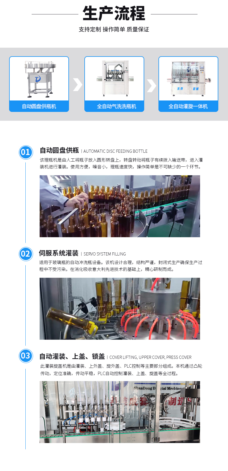 本灌裝流水線設(shè)備具有穩(wěn)定可靠、自動化水平高,相比同類產(chǎn)品有著更長的使用年限,維護(hù)簡單,整線中各設(shè)備的協(xié)調(diào)性、連貫性強(qiáng),整線設(shè)計合理等特點。灌裝設(shè)備采用獨家專利系統(tǒng)結(jié)構(gòu),為當(dāng)今行業(yè)內(nèi)水平,整線滿足量產(chǎn)化、集成化生產(chǎn)的需要。