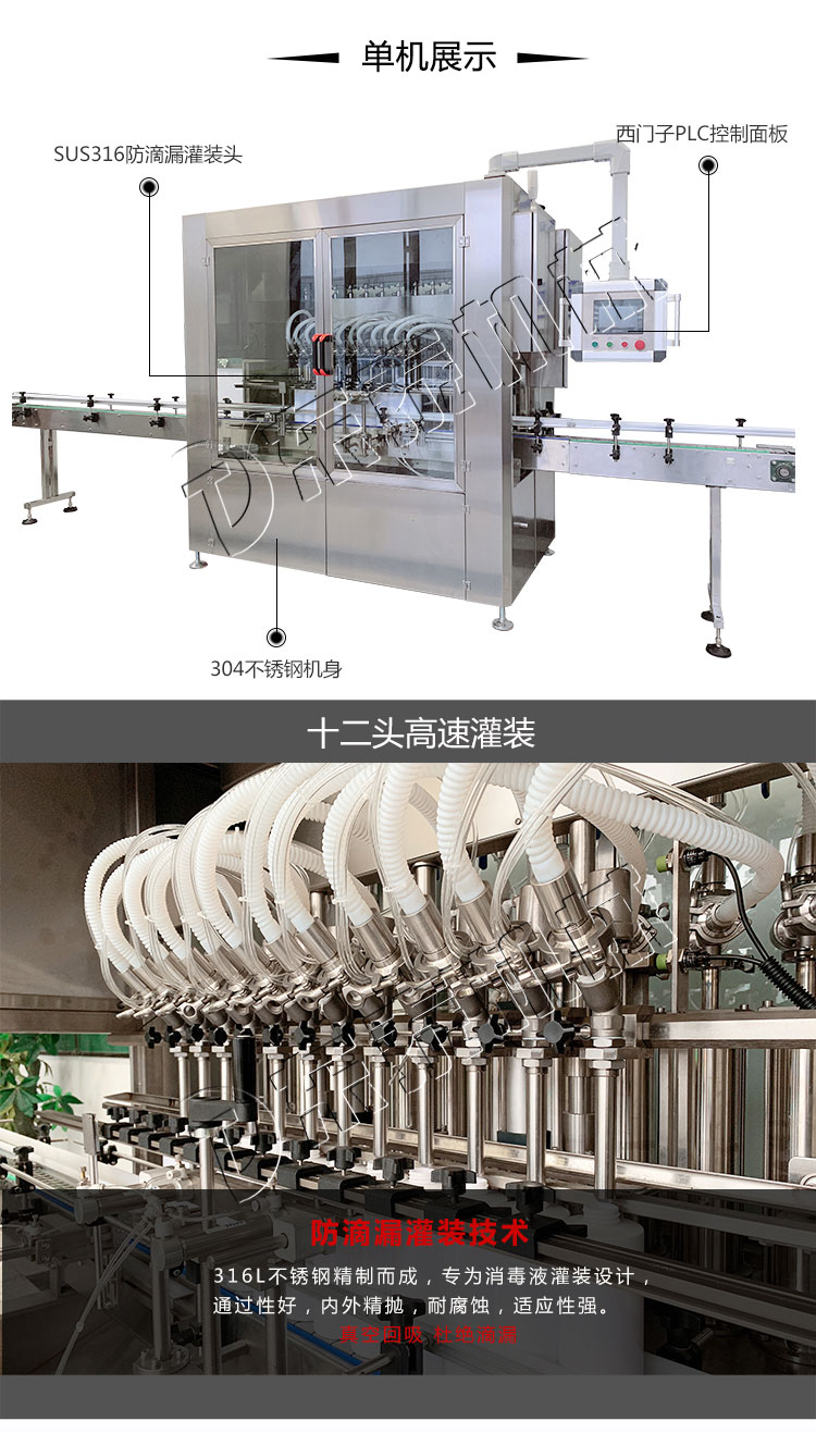 5、具有無瓶不灌裝、自動進(jìn)瓶出瓶、自動定位灌裝、自動控制液位等功能,自動化程度高;灌裝嘴設(shè)計科學(xué)合理,配防滴漏裝置,灌裝不滴漏,擁有物料瓶及設(shè)備的干凈衛(wèi)生。